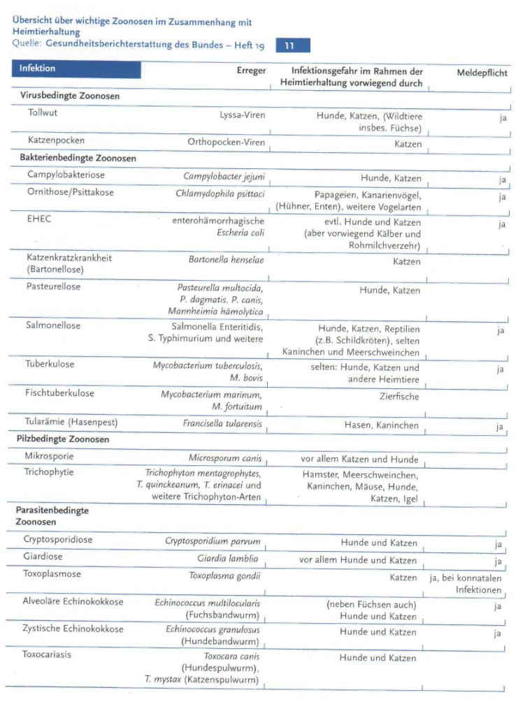 Als Hundeführer eines Therapiebegleithundes sollte man über diese Infektionskrankheiten informiert sein um diese weitestgehend ausschließen zu können. Hier eine kleine Übersicht aus einer Broschüre des Robert-Koch-Istituts.