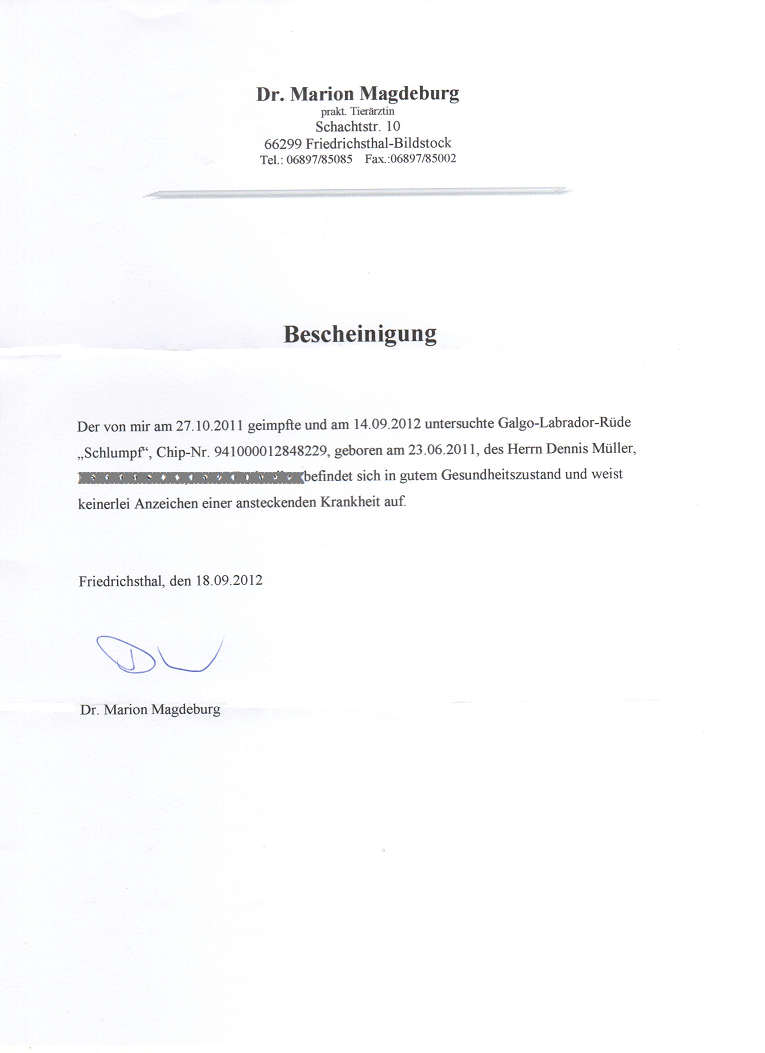 ![]() Vorliegende Gesundheitsbescheinigung wird halbjährlich erneuert und liegt dem Tierhalter vor. Bitte haben Sie Verständnis, dass hier keine aktuelle Bescheinigung abgelichtet werden kann. |