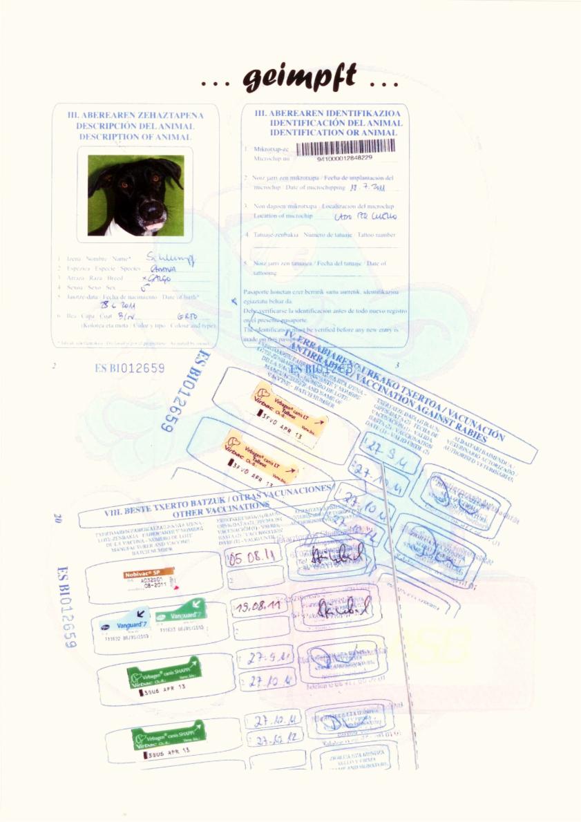 DIe Impfungen werden im empfohlenen Rhytmus erneuert und sind stets aktuell, was der Hundeführer durch sein Impfbuch nachweisen kann. Bitte haben Sie Verständnis, aus Zeitgründen sind hier nicht die aktuellen Impfungen abgelichtet. |